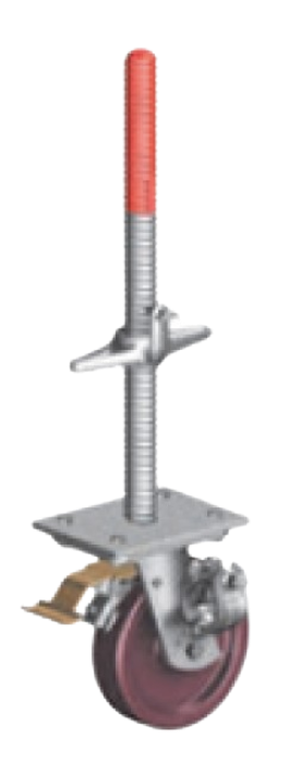 Опорные элементы лесов. Используется в конструкциях передвижных лесов (башни, объемные леса, подвесные, консольные и пр.) Домкрат на колесной базе обладает высокой несущей способностью (1000 кг) и плавностью хода. Винтовая часть опоры обеспечивает точную регулировку уровня и центральную передачу усилий на само колесо. Такая система гарантирует точную регулировку уровня и безопасность работы. Колеса домкрата имеют стоп-педаль, которая в активном положении блокирует колесо от перемещения и поворота колеса вокруг своей оси.